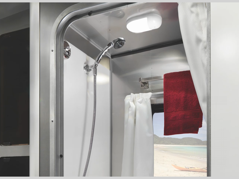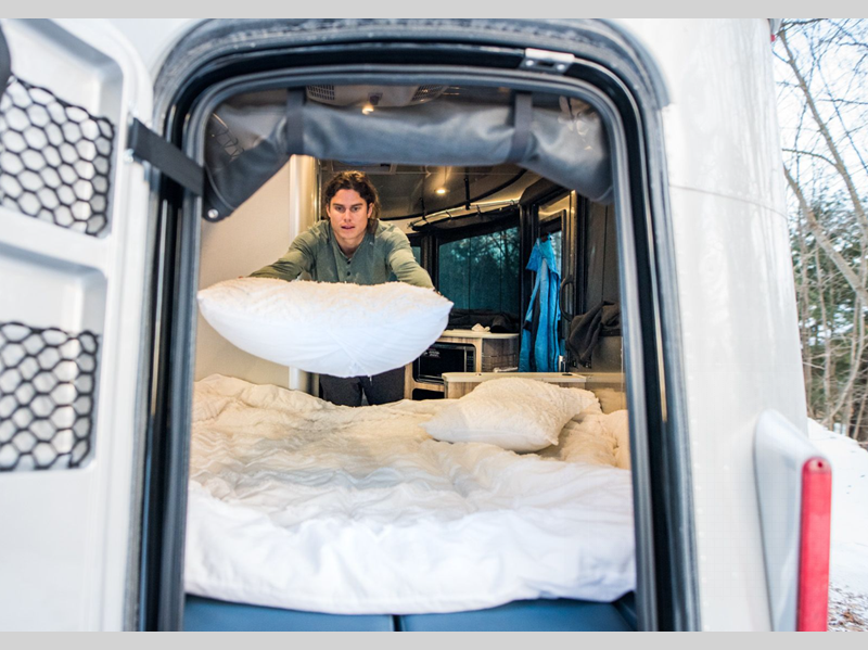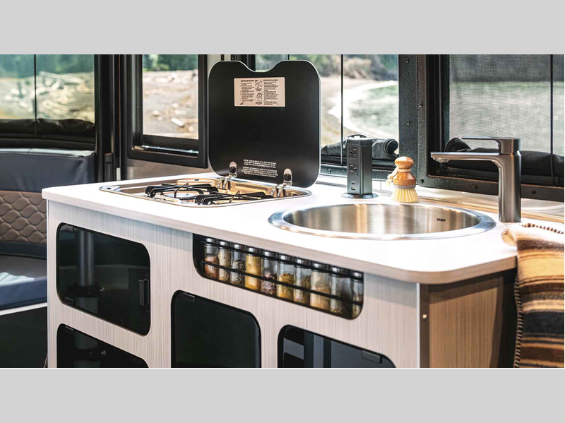Each is built with a riveted aluminum superstructure, an aerodynamic body and roof profile to help increase fuel efficiency, panoramic front windows to see the outside while inside, and an enclosed, aluminum insulated heated underbelly for better protection against the elements. The interior offers a wet bath, kitchen amenities, handcrafted marine-grade Lite-Ply laminated interior cabinetry, seamless vinyl flooring for easy care, and comfortable sleeping accommodations.